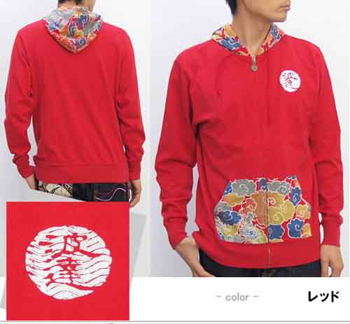 素材 綿:100%・20/2天竺 フードと前ポケットに雲&ドラゴン柄をあしらった和柄ZIPアップパーカー。