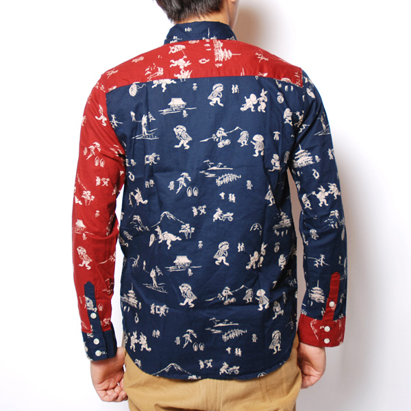 サイズ詳細サイズ 中 大 特大身幅 50.0 53.0 56.0 着丈 71.0 74.0 77.0 肩幅 43.0 45.0 47.0 袖丈 60.0 62.0 64.0 同柄異色のクレイジー切替がCOOLな長袖シャツ登場!<デザイン> 兎にも角にもインパクト大!流行のクレイジー切替仕様が目を引くシャツのご紹介です。 鳥獣戯画の柄生地を異色使いで縫製。遊び心溢れる柄と配色は派手でありながらも決して子供っぽくはならない、まさに遊び心を忘れない大人に着てほしい一枚 となっております。もちろんそれだけでは終わらない泥棒日記、左胸ポケットにも遊びを利かせて2パターンの仕様にアジャストOK♪タバコなど を入れる時は折り畳んだ状態で、サングラスやメガネなどを入れる時は立ててボタンで留めればちょうど収まります。気分に合わせて見せ方を変え るのも◎ 価格:13,440円(税込)