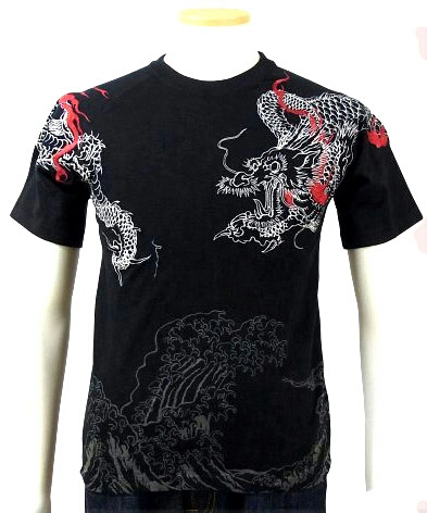 赤富士波に巻き龍柄刺繍半袖Tシャツ。
