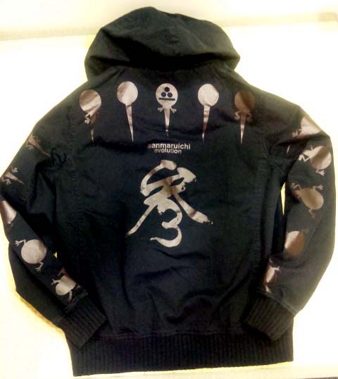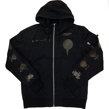 ミリタリーベースのパーカーにエボ柄をプリントと革パッチ(胸)で落とし込みました。