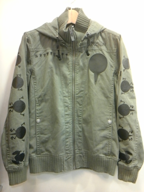 ミリタリーベースのパーカーにエボ柄をプリントと革パッチ(胸)で落とし込みました。