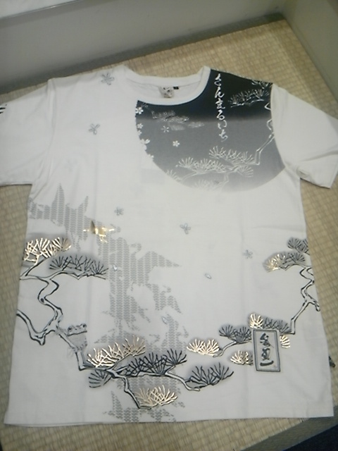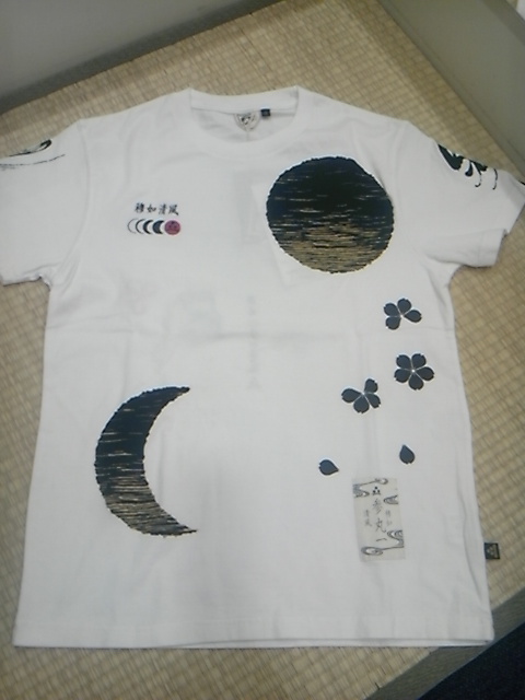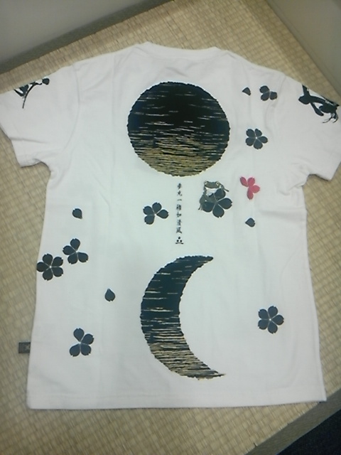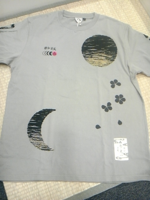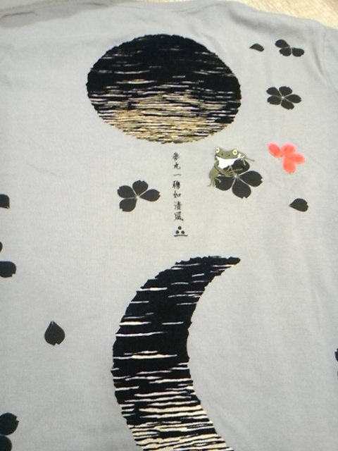 月影柄Tシャツ。月の満ち欠けをゴールドプリントの上からフロッキーをかぶせるという大胆な手法で表現。