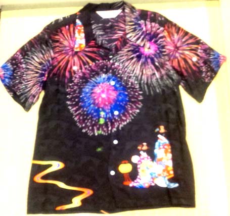 シルクシャツに柄を編みこんだ生地にさらに花火と舞子のプリントを