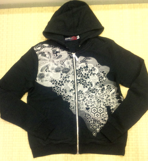 フロントには、抜染プリントでシンプルにバックは逆に綺麗な色で刺繍を施して