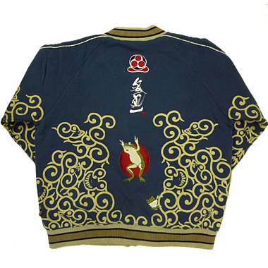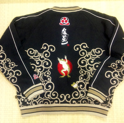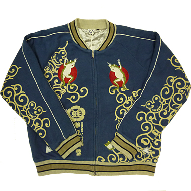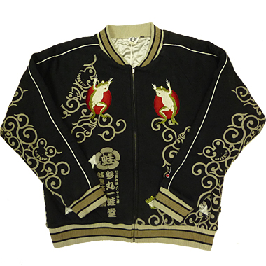 コットン100% 裏毛 (裏地 サテン100%) 毎年恒例の裏毛中綿スカジャンです。今年のテーマである蛙唐草を落とし込みました。気楽に着られるオールマイ ティな一着です! 価格:\13,440(税込)