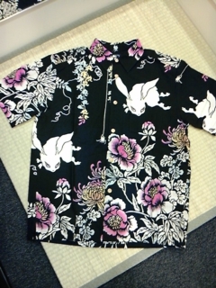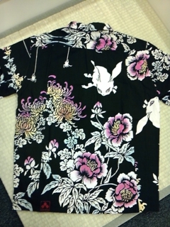 手ぬぐいシャツ藤牡丹兎柄。
