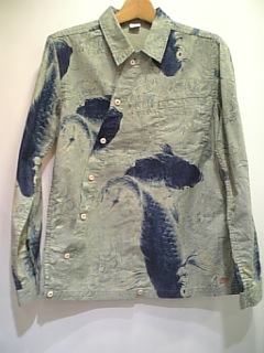 アシンメトリーの纏い鯉柄シャツ。