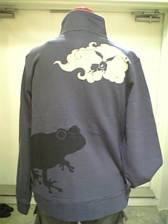 大蛙、雲兎、蛙紋柄のスタンドジャケット後ろ姿。
