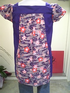スクゥエア衿のチュニック。パープル桜柄の後ろ姿。