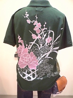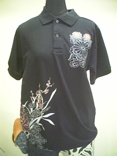 花かごポロシャツ。色は黒、白、グリンがあります