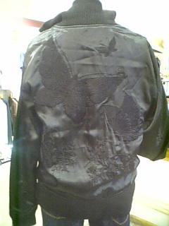 スカジャージの後ろ姿です。黒くてわかりにくいですが、大きな刺繍の蝶が舞っています。