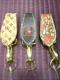 レザーのキーホルダー。 桜流れとモノグラムと唐草泥棒柄があります。
