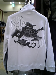 スタンド前開きボタンジャケットが入りました。富士雲兎柄の後ろ姿です。
