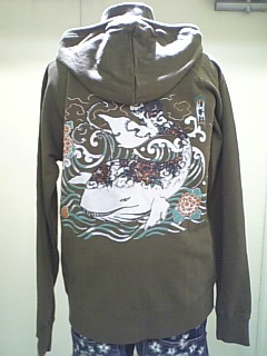 スタンドパーカージップアップの後ろ姿。丸鯨と浪華鯨柄です。