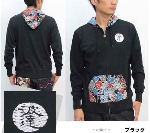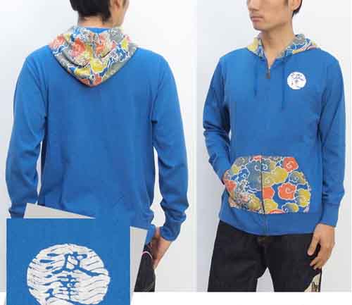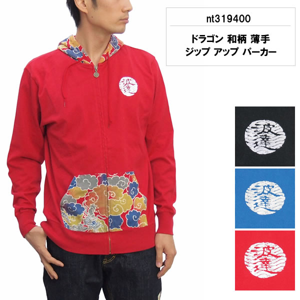 素材 綿:100%・20/2天竺 フードと前ポケットに雲&ドラゴン柄をあしらった和柄ZIPアップパーカー。