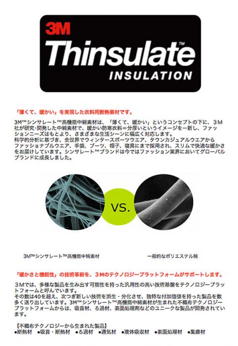 防寒衣料などの中綿に使われる断熱保温素材のシンサレートを使用。